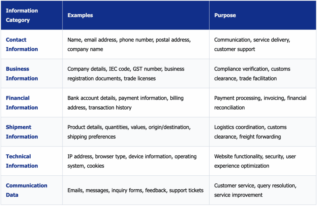 Examples of Third-Party Services: Payment gateways, social media platforms (LinkedIn, Facebook), shipping carrier tracking portals, government customs websites, trade directories, and business registries.